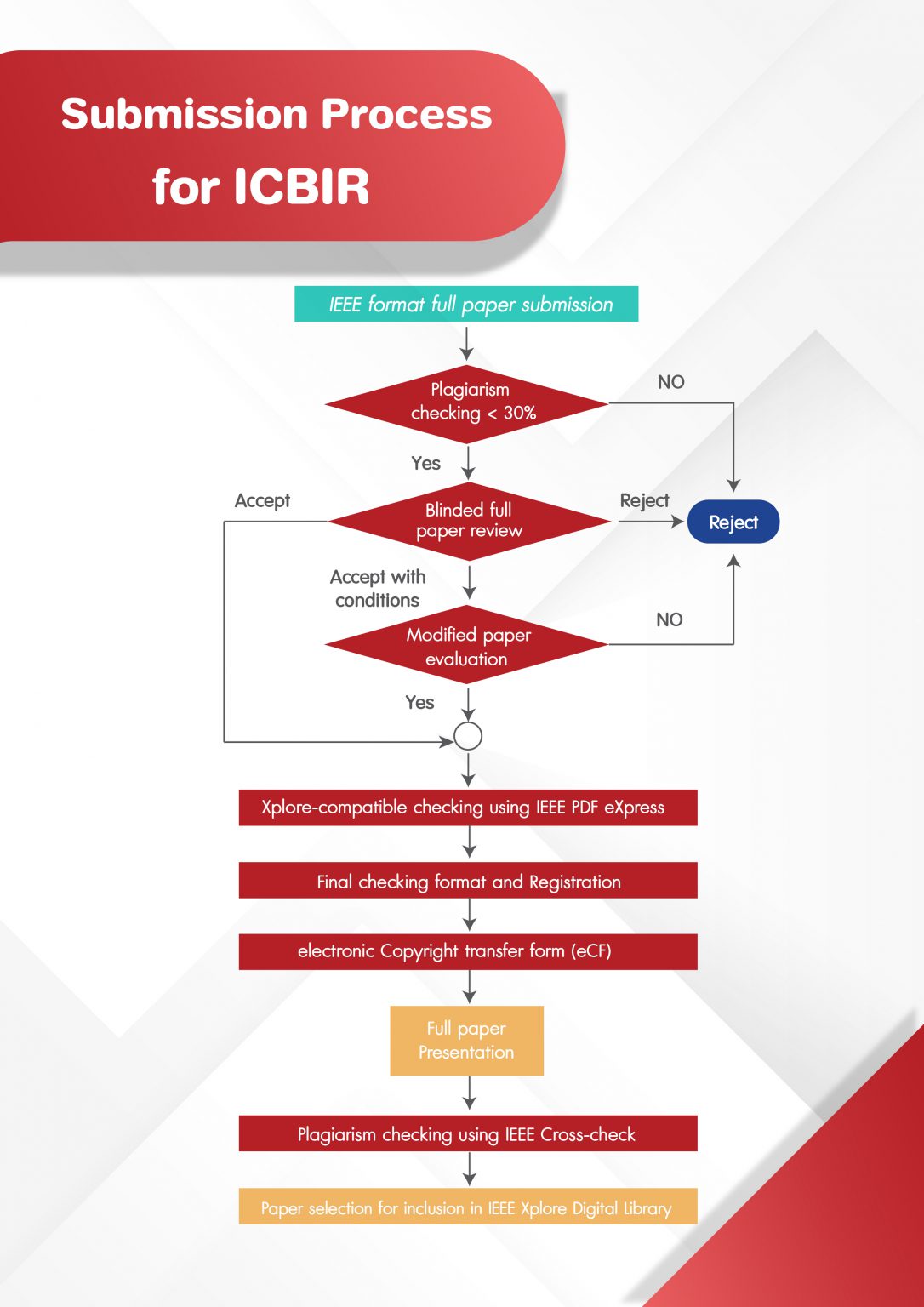 The full paper must be prepared in IEEE double-column manuscript format by using IEEE Microsoft Word in A4 size or LaTeX template. Your paper MUST be written strictly in English within 4-6 pages in length of A4 size, including all text, figures, tables, and references. The paper should consist of up to 200 words abstract and up to 5 keywords. No page number should be printed. The manuscript MUST be submitted to ICBIR online submission system (EDAS) in PDF format only (The instruction for online submission is available below). The submitted papers must not be published or under consideration to be published elsewhere.